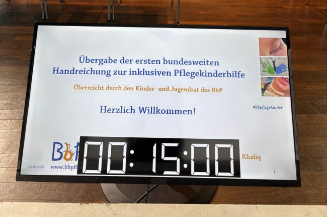 Die Veranstaltung bildete den Abschluss eines Beteiligungsprozesses initiiert durch den Bundesverband behinderter Pflegekinder. Am 16.12.2025 übergab der BbP im Familienministerium in Berlin die Handreichung zur inklusiven Pflegekinderhilfe an die Politik. Diese wurde von der Agentur selbstverständlich nicht nur in einfach Sprache übersetzt, sondern auch grafisch gestaltet. Für das Event organisierten wir zudem einen Livestream und begleiteten die Veranstaltung vor Ort. Der Prozess bis zur Fertigstellung wurde von uns ebenfalls begleitet durch Arbeitsgruppenmoderation und Contenterstellung für Social Media.